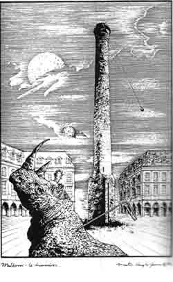 in Études littéraires, avril 1978, Né à Bristol (Angleterre) en 1943, Martin VAUGHN-JAMES a successivement publié : Eléphant, a boovie (New Press, Toronto 1970), The Prolector (1971), The Park (1972) et The Cage, a visual novel (1975), ces trois derniers ouvrages chez Coach House Press (Toronto). Particulièrement intéressé à l'élaboration de récits d'images (visual novels ), dans le sillage du Nouveau Roman, et aux rapports entre des images et un texte, il s'est également fait connaître par une collaboration régulière à la revue Minuit. Tout dernièrement, il produisait une série de dessins à partir du générique de Leçons de Choses de Claude Simon. À la demande de Simon lui-même, ces dessins ont accompagné la publication de l'entrevue qu'il accordait récemment à La Nouvelle Critique (no 105, Juin-Juillet 1977). Martin Vaughn-James a réalisé ces " six visions de Maldoror " tout spécialement pour ce numéro d'Études Littéraires.